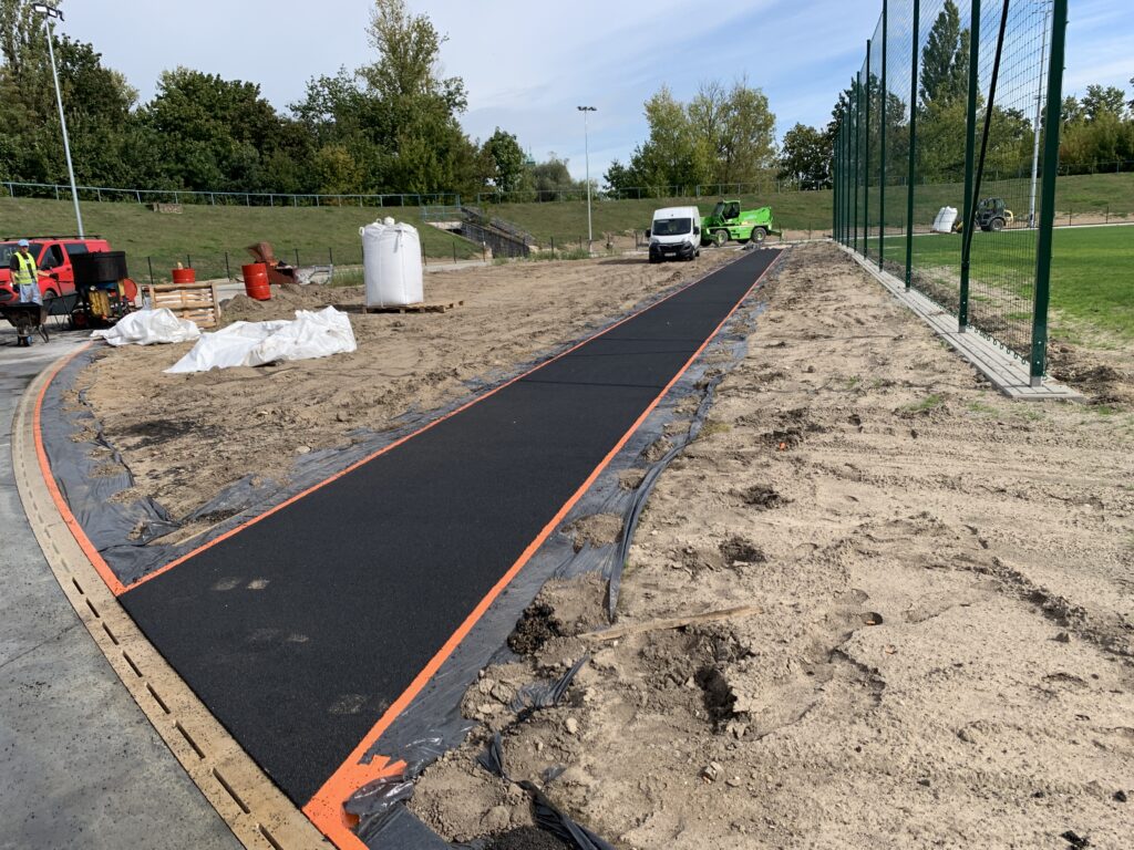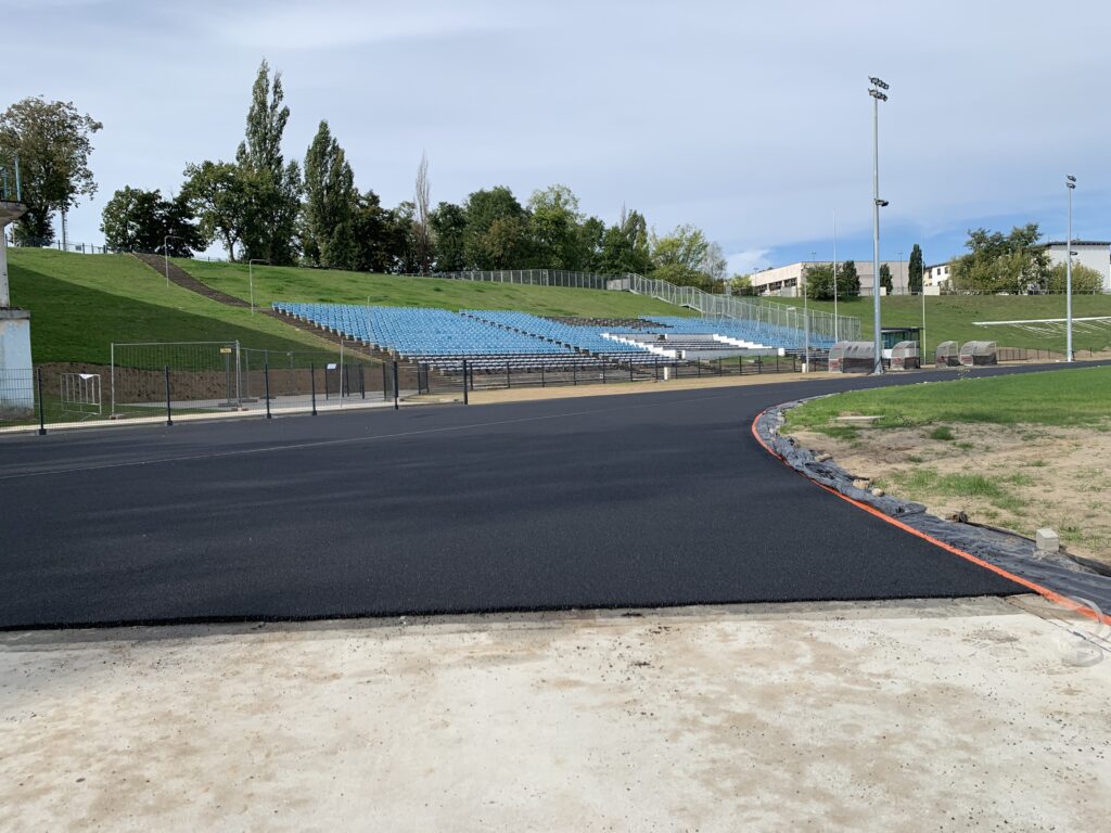Nieco ponad miesiąc pozostał do zakończenia inwestycji na stadionie Mieszka. Budowa bieżni dla biegaczy wchodzi w decydującą fazę i po wykonaniu podbudowy, właśnie rozpoczęto wylewanie głównej nawierzchni poliuretanowej. Na razie wygląda to jak asfalt, ale w rzeczywistości jest to zmielony granulat połączony ze specjalnym lepiszczem, czyli klejem. Dziś wykonano niemal całą prostą przy lewej trybunie, zakończenie planowane jest na piątek. Wszystkich uspokajamy – gnieźnieńska bieżnia nie będzie czarna, bo ostatnim etapem będzie malowanie specjalnym natryskowym systemem poliuretanowym.