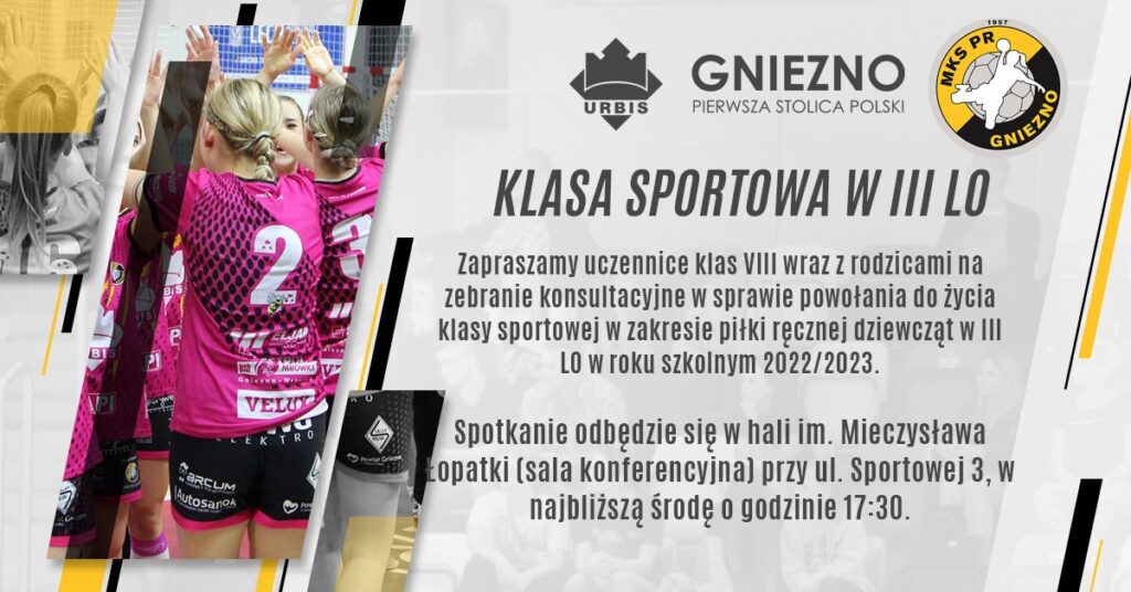 Zapraszamy uczennice klas VIII wraz z rodzicami na zebranie konsultacyjne w sprawie powołania do życia klasy sportowej w zakresie piłki ręcznej dziewcząt w III LO Gniezno w roku szkolnym 2022/2023. W zebraniu wezmą udział przedstawiciele starostwa powiatowego, oraz dyrektor III LO. Wszystko odbędzie się w najbliższą środę o 17.30 w hali im. M.Łopatki w Gnieźnie.