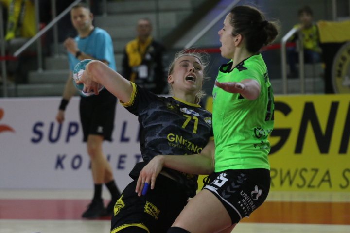 Chociaż MKS to beniaminek rozgrywek Superligi w sezonie 2022/2023, nie raz udowodnił, że należy się z nim liczyć. Podopiecznym Roberta Popka zdarzało się pokonywać wyżej notowane zespoły, a ich starcia z Młynami Stoisław należały do zaciętych już na etapie okresu przygotowawczego. Gnieźnianki postawiły koszalińskiej ekipie trudne warunki już na samym początku rywalizacji drugiej rundy. Koszalinianki miały spory problem z pokonaniem bramkarki Dominiki Hoffmann. Niemniej, dostępu do koszalińskiej bramki solidnie broniła też Natalia Filończuk. Kolejne trafienia przychodziły więc z trudem obu zespołom. To pierwsze, wywalczone z rzutu karnego należało do gospodyń. Później zespoły grały „bramka za bramkę”. Trwała zatem zacięta rywalizacja, której należało się spodziewać biorąc pod uwagę przebieg wcześniejszych spotkań drużyn z Koszalina i Gniezna oraz to, że obie walczą o miejsce w pierwszej szóstce po dwóch rundach. Dla ósmego obecnie w tabeli Urbisa z czternastoma punktami na koncie i dziewiątych Młynów Stoisław z jedenastoma „oczkami” była to niewątpliwie bardzo ważna rywalizacja na drodze do spełnienia swoich sportowych celów. Na tablicy niemal stale widniał remis. Po dziesięciu minutach spotkania było 4:4. Być może liczba trafień byłaby wyższa gdyby nie błędy, które zdarzały się po obu stronach, niemniej remis, jaki by nie był, uczciwie obrazował to jak obie ekipy prezentowały się na parkiecie. W 12. minucie podopieczne trenera Knopika „odskoczyły”. Prowadziły 6:4, ale to zdecydowanie za mało, by mogły mówić o bezpiecznej przewadze. Przyjezdne przez dłuższą chwilę cieszyły się prowadzeniem, ale szczypiornistki Urbisu nie zapominały o tym, o co walczą. Odrobiły niewielkie straty (22. min – 10:10), niebawem objęły prowadzenie 13:12 (28. min), a chwilę później było już 14:12 na korzyść gospodyń (29. min). Zespoły schodziły do szatni przy wyniku 15:14.