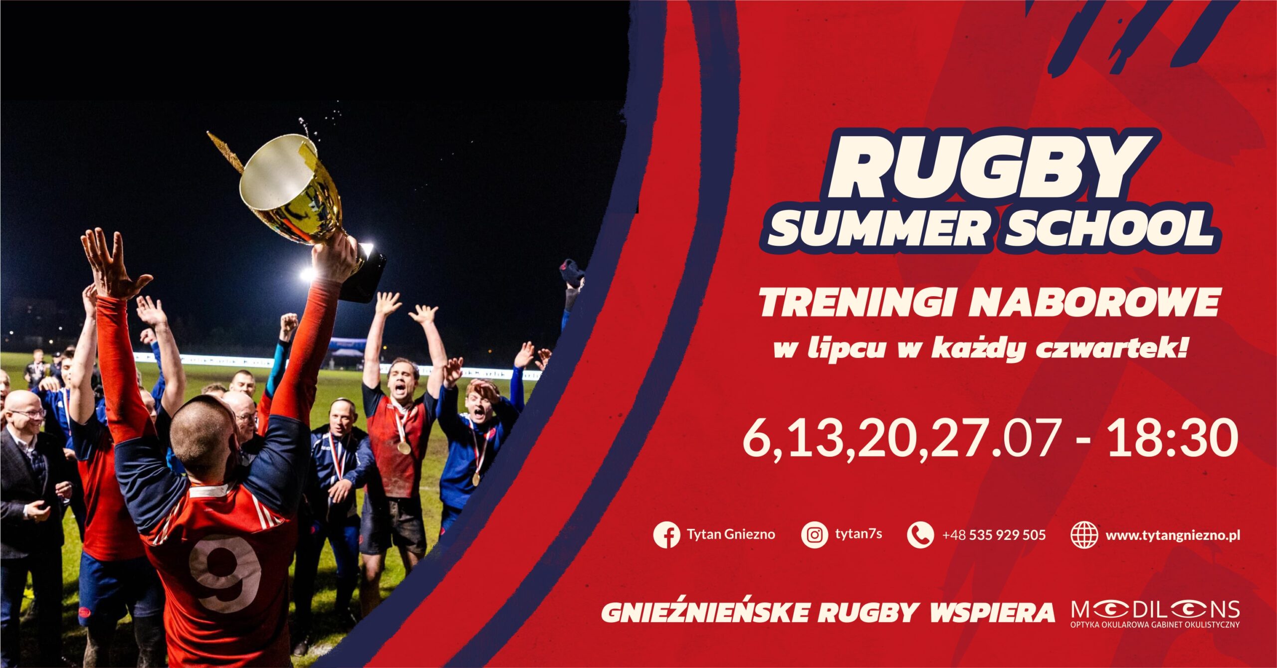 „W tym roku zdecydowaliśmy się kompleksowo podejść do tematu i zamiast organizować pojedynczy trening naborowy postawiliśmy na cykl takich zajęć. Wiadomo jak to w lipcu i sierpniu – wakacje, urlopy. Dlatego stawiamy na serię treningów, żeby każdy mógł dołączyć w odpowiednim dla siebie terminie. W lipcu treningi otwarte będą odbywać się w czwartki o godzinie 18:30 na górnym boisku przy ul. Strumykowej. Choć drużyna seniorów ma urlop po historycznym sezonie to niektórzy nie potrafią odpocząć od rugby. Dlatego klub postanowił zorganizować zajęcia dla wszystkich zainteresowanych rugby w Gnieźnie i okolicach. Wakacje to idealny czas, aby dołączyć do drużyny, ponieważ można na spokojnie pokazać nowym osobom na czym polega rugby, jak podawać piłkę, jak ustawiać się na boisku i wiele innych elementów jajowatego sportu” – zaprasza na Letnią Szkołę Rugby Łukasz Dziel, Kierownik drużyny gnieźnieńskich Tytanów.