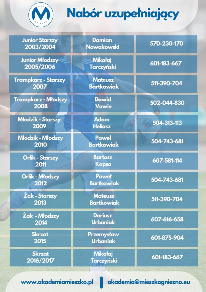 Akademia Mieszko Gniezno ogłosiła nabór uzupełniający do prowadzonej przez siebie Akademii. Co oferuje i kogo szuka, o tym poniżej.
